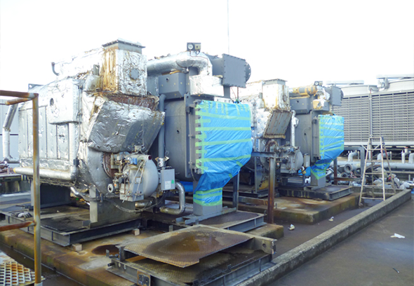 地下の冷凍機3基解体し、屋上の冷却灯3基解体の作業。冷凍機1基につき約16t、冷却棟1基につき4tの重量です。全行程は約1ヶ月でした。