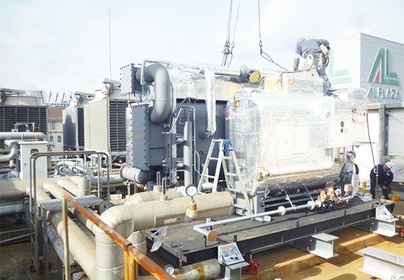 地下の冷凍機3基解体し、屋上の冷却灯3基解体の作業。冷凍機1基につき約16t、冷却棟1基につき4tの重量です。全行程は約1ヶ月でした。
